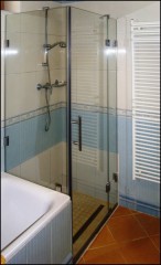 A kádat széles peremmel építették körbe. Ehhez kellett illesztenünk a zuhanykabin oldalfalát. A zuhanymedence szélessége megengedte, hogy az ajtót viszonylag széles fix falhoz zárjuk, a fix falat pedig az oldalfalhoz ragasszuk. No meg az elmaradhatatlan ragasztott polcok.